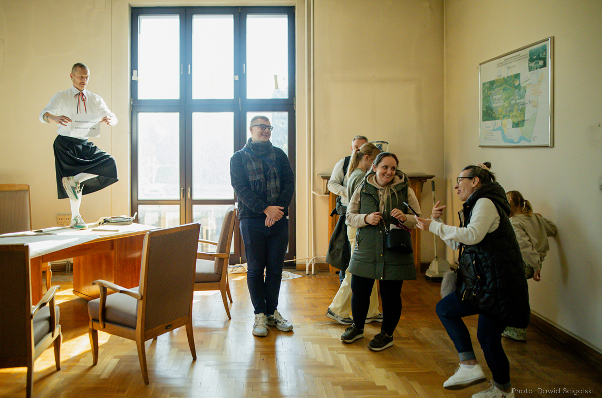 Classical guided touring gave way to performance—every interaction became a one-off event. Any fragment of the “S” and “Z” buildings could transform into a pretext for action. We also brought into this shared journey a two-meter-tall plush elephant that I sewed specifically for the occasion. Beyond its mass of upholstery foam, it carried a hint of humor and a weight of history (the “Z” building—the former administration—was long nicknamed “the elephant,” as its monumentality, opulence, and dominant position set it apart from the more modest “S” building intended for the general public). This architectural “elephant” became for us a symbol of the heaviness of the old system, in which the apparatus of power rolled through social life, controlling and regulating everything. Simply entering that excess—kilograms of marble, steel, and crystal—is enough to stir the imagination. Why illustrate further, when “an elephant is exactly what it is”? It was enough to “lift” it—literally and metaphorically—to let the history of the space and its tensions reveal themselves on their own.