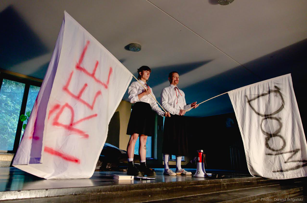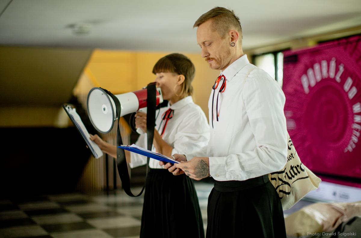Between late September and early October 2025, together with Lukas Wójcicki, we had the opportunity to conduct a series of performative guided walks as part of Kraków’s Nowa Huta Odyssey, organized by Teatr Łaźnia Nowa and Dom Utopii, at the invitation of the Museum in the Underground and the event’s curator, Łukasz Trzciński. The space of the Nowa Huta Administrative Centre – with its heavy, monumental architecture and parallel, multi-layered histories—was not merely a backdrop but a living partner in action.